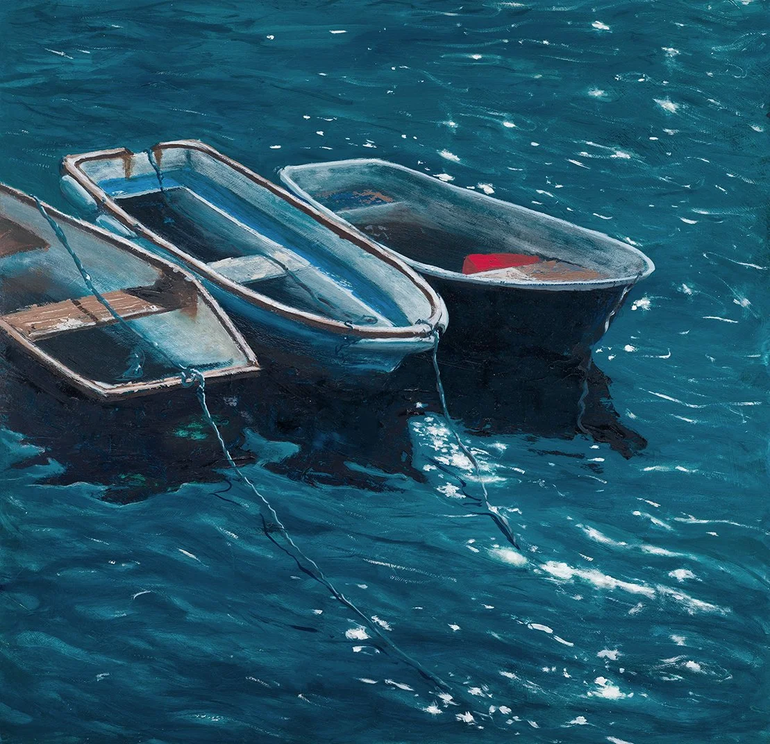 Oil on board “floating” frame in white.